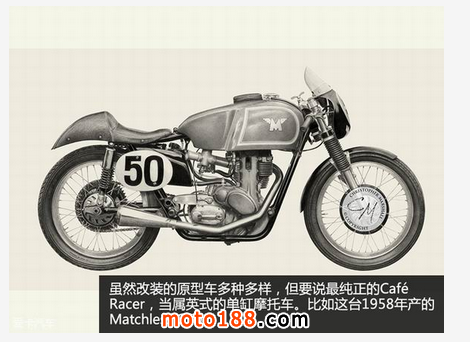 現在看來平白無奇,但在當時,這樣的一個稱號可以說是“無上的榮耀”。所以為了它,眾多愛好者開始對自己的愛車進行重度改裝,以得到更快的速度。那些退伍士兵的機械知識則得到充分發揮。在不斷摸索以及GP比賽的啟示下,他們認為將車把設計成分離式,油箱形狀細長且兩側帶有凹槽(讓膝蓋可以緊貼油箱)的形式最為出色。