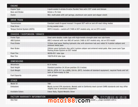 從規格表中可以看出,Africa Twin搭載排量為998c.c.的并列雙缸水冷發動機,最大馬力94匹(7500轉),峰值扭矩98牛米(6000轉),油箱容量為18.9升。Africa Twin的車重數據較為詳細,包括凈重(不含油)和整備重量。其中,凈重包括:標準車重208公斤、配備ABS的車重212公斤、配備DCT(雙離合變速器)的車重222公斤;整備重量包括:標準車重228公斤、配備ABS的車重232公斤、配備DCT 的車重242公斤。另外,Africa Twin的整備重量比KTM 1190 Adventure R少5.4公斤、比寶馬R 1200 GS Adventure少31.8公斤,但是裝上DCT的Africa Twin卻要比1190 Adventure重9公斤。