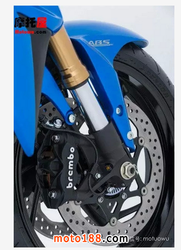 310mm的前剎車碟與GSX-R1000相同的鮑魚卡鉗使得你輕捏剎車就有足夠的制動力,而ABS的加入只增重1.4磅而已