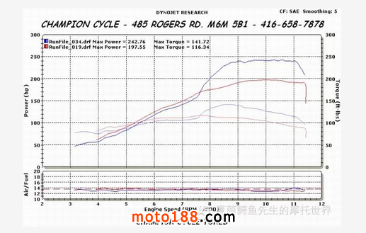 除了這個瘋狂的Muzzy氮氣套件,老爺子車上的其它部分的改裝也是偏重于性能。Muzzy鈦合金-碳纖維 4-1-2的全段排氣系統,Dynojet的電腦+Auto tune套件,Dynojet全時調節LCD屏幕,BST碳纖維輪轂,快速換擋。在爆改完畢之后,這輛瘋狂的”旅行車“輪上動力接近250hp,相當于一輛MOTOGP戰車,2秒破百,5檔就可以拉到320千米/小時的時速!