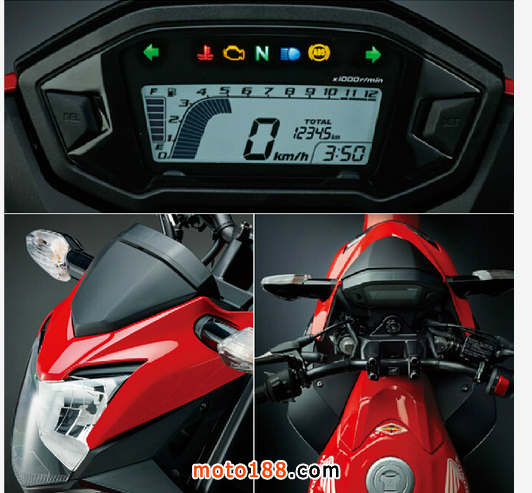 CB250F有全新設(shè)計的表板和頭燈,當然還有街車化較高的轉(zhuǎn)向把手。至于車尾部份、死氣喉和前后座位連扶手都沿用CBR250R跑車設(shè)計。