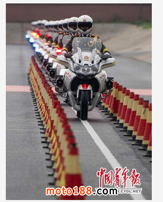 為了提高心理素質,摩托車禮賓護衛隊在訓練中加上了錐型帽作障礙物。