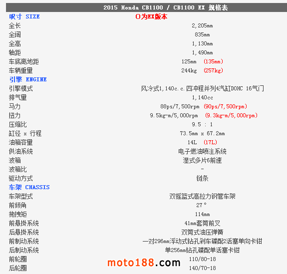 另外,HONDA CB 1100EX配置了17升油缸,。外觀上,EX版的引擎外殼、輪框為銀色及電鍍頭尾沙板與四出2排氣喉。