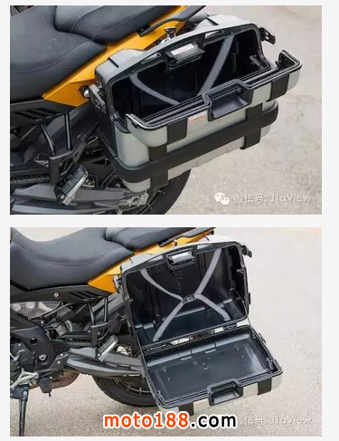 兩個(gè)行李邊箱看上去非常的結(jié)實(shí),而且設(shè)計(jì)非常巧妙,既可以從頂部打開(kāi),也可以像一般的邊箱一樣從側(cè)面打開(kāi)。側(cè)面打開(kāi)有利于車(chē)主存儲(chǔ)大型的物品。缺點(diǎn)就是一打開(kāi),里面的東西可能就會(huì)滾出來(lái)。從頂部打開(kāi)的話(huà),可以方便車(chē)主拿取小物件。總之,兩種方式供騎士選擇,結(jié)合在一起給車(chē)主騎行提供更大的便利。