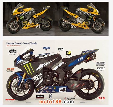 美國YAMAHA廠隊的YZF-R1有非常搶眼的格仔廠花,較過去拉花特別是黑白格仔間有60th字樣,戰車前後均使用BRAKING煞車碟。