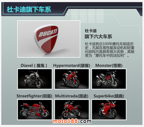 杜卡迪現(xiàn)在的車系包括有Diavel魔鬼,是美式巡航車;Hypermotard 駭客,是滑胎車,也能算是街車;Monster怪獸,是標準的街車;Streetfighter街霸,也是街車;Multistrada攬途,是全地形車加巡航跑車;Superbike超跑,是標準的跑車。街車和跑車的區(qū)別,跑車的發(fā)動機馬力更大,高轉(zhuǎn)表現(xiàn)更好,重量也更輕,配置也高,前傾角也小,整個車被導流罩包裹。杜卡迪是世界頂尖的摩托車制造商,他在國內(nèi)最便宜的車型是Monster795,價格是11.9萬,發(fā)動機87馬力,車重161公斤。