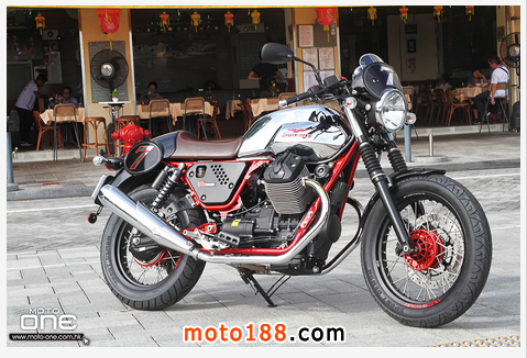 ●V7 II Racer 鮮紅色的車(chē)架與尾擔(dān)。