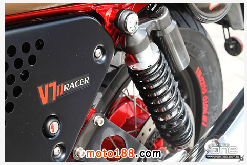 限量年產(chǎn)1000臺(tái):每臺(tái)車(chē)架上均列明獨(dú)有限量序號(hào),以電鍍紅色雙搖籃式車(chē)架配以黑色車(chē)身。耀目閃亮的電鍍銀色油缸上面,配置精緻烙而有MOTO GUZZ 字款的皮帶, 優(yōu)雅啡色猄皮單座位設(shè)計(jì),可調(diào)較位置的腳踏,輕量化的手把,Bitubo 可調(diào)整的避震,傳統(tǒng)鋼線轆呤,杯士軚配以傳統(tǒng)RACER 的座姿。種種不同的細(xì)節(jié)足以令V7 II RACER 成為與眾不同的車(chē)款。加上新一代六速波箱,ABS 剎車(chē)系統(tǒng)及MGCT 軌跡系統(tǒng),更加如虎潻翼。因此, V7 II RACER 是每一位電單車(chē)愛(ài)好者夢(mèng)寐以求的收藏珍品。