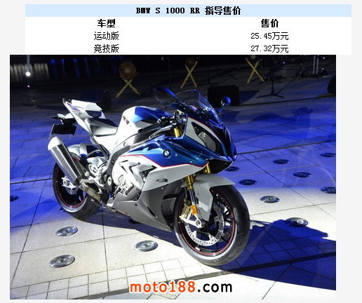 此次發布的BMW S 1000 RR摩托車共有2款車型,官方建議零售價為運動版為25.45萬元;競技版為27.32萬元。