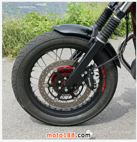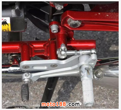 跟同一集團(tuán)的Aprilia 賽車來相比來說, 配置鋼骨車架,還有后面不可調(diào)的復(fù)古bitubo避震器,好像顯得略遜一籌, 唯一現(xiàn)代化的是鋁合金后搖臂, 但話說回來,哪一臺(tái)復(fù)古車不是這樣的設(shè)計(jì)? 但可以從我穿得軍靴前面摩擦的痕跡可以期待他的彎道樂趣是有的,如果你敢壓車的話!