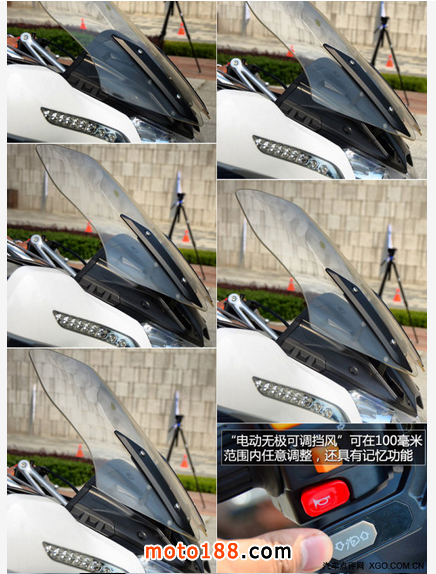 值得一提的是,創新設計的“電動無極可調擋風”更是為愜意的摩托車旅行錦上添花,可以滿足不同身高人群和不同行駛狀態下的需要。不僅可實現100毫米范圍內的任意位置調整,還具有位置記憶功能,這一功能只有在國外高端品牌的頂級旅行車上才會出現。