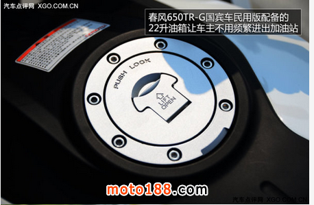 春風2016款650TR-G原型車為國賓車隊摩托車護衛隊用車,相比國賓車,2016款650TR-G保留了大多數配置與設計。取消了一切警用燈具,如:車身貼紙、揚聲器以及無線電系統等。警用裝備按照相關法規是不能出現在民用車型上的,否則是無法正常上牌的。此外,單座改為雙座,更為實用。