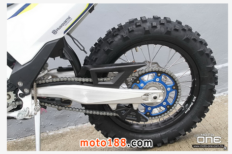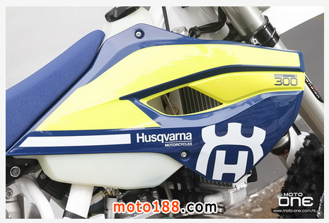 Husqvarna TE300挾54ps馬力峰值傲視云云對手,比TE250多岀50c.c.,馬力與扭力高出相當,但竟然只有104.4kg的車子乾重,僅比前者多出 0.2kg,秘密在那里?其實沒有秘密,只是大量采用剛度適中的輕合金,除了那鉻鉬合金車架,大概可以包括稱之為高拉力鋼管車架吧。當然是非一般鋼管,這 個在TE250文 中己介紹過,在此不再重提,現在就著眼於她的乾重,證明在開發TE250時,各零部件已預留充裕的強度去應對更大馬力/扭力的輸出,主要的零部件無需作出 改動去迎合,只是汽缸孔徑改動72mm,活塞行程維持TE250的72mm,即72x72mm缸徑/活塞行程以1:1比例實屬罕見。
