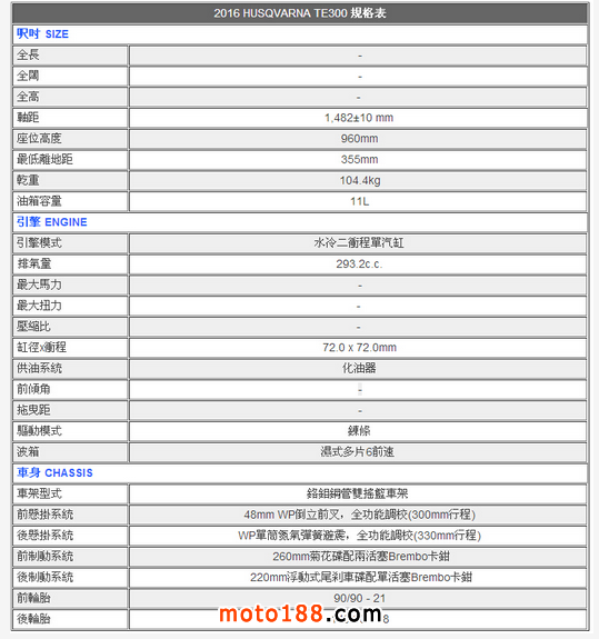 水冷式2沖程293.2c.c.單汽缸引擎,電撻與腳撻兼備六前速波箱,WP前後懸掛維持不變,油壓式離合器剎車系統均與TE250相通,座高維持960mm,就這麼看上去,兩者基本上并不存在差異,只各自有本身的個性。