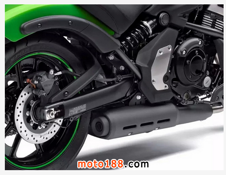 VULCAN S的底盤設置,同樣反叛了美式巡航的傳統,放棄了鋼管搖籃式車架,改為采用VERSYS 650的結構,在用高拉力鋼管和鋁合金側板緊緊擁抱直列雙缸的同時,還用鋼管從氣缸兩側圍住發動機,顯得異常緊湊。采取接近水平右側安裝的單筒減震器,同樣借鑒了VERSYS 650的結構,行程為80 mm,彈簧預載7階可調;前叉則是41mm正立式前叉,提供130mm的行程。此外,排氣系統也與傳統巡航車不一樣,采用了短湊直管,并且安裝在發動機之下,此舉有利于降低整車重心,提高質量集中化程度。