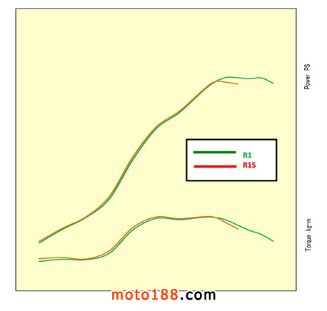 ●綠色是R1及R1M的扭動及馬力輸出,而紅色是R1S,尾段輸出明顯較少,某程度來說更適合街道使用,但不適宜要求高轉輸出的賽道使用。