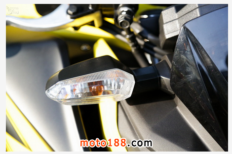方向燈殼利用熏黑創造出更好的質感,但在烈日騎乘時不容易判斷方向燈是否正常運作。
