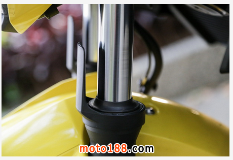 前避震采用37mm正立式前叉,阻尼與預載均不可調。內管前方配有小檔片擋住飛濺的石頭,避免內管受傷。