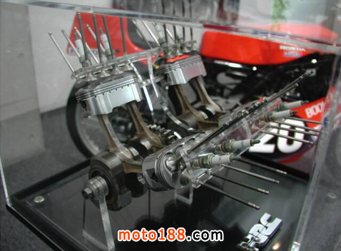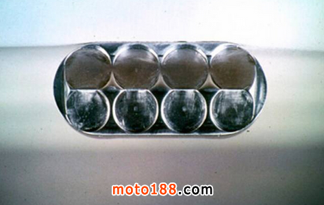 為了完成這一挑戰(zhàn),Honda 生產(chǎn)出世界上獨(dú)一無二的“橢圓氣缸“,為了提高轉(zhuǎn)速及氣缸內(nèi)的燃燒速度并符合FIM的500CC賽車氣缸不得多于4個的比賽條例,設(shè)計師們還以天馬行空的創(chuàng)造力將V8引擎相鄰的兩個活塞合并為一個,于是橢圓活塞的神話就此誕生。