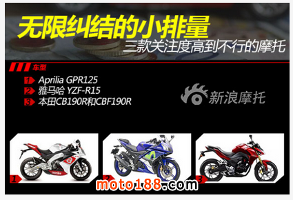 先介紹一下本期“培”你選車的三位主角:Aprilia GPR125、雅馬哈YZF-R15、五羊本田CB190R和新大洲本田CBF190R(以下簡(jiǎn)稱190R)。2015年8月20日“最強(qiáng)150”雅馬哈YZF-R15上市、僅僅四天后Aprilia“王者級(jí)”小排量跑車GPR于江蘇大豐接踵而來(lái)、8月25日本田放出了“超越自我”的運(yùn)動(dòng)街車CB190R和CBF190R即將上市的消息。兩個(gè)月以來(lái),大培子的微信號(hào)每天都沒(méi)閑著80%的問(wèn)題都是關(guān)于這三款摩托車的,可見(jiàn)摩友們對(duì)它們的關(guān)注度是極高的,到底選哪款呢?您是否為之糾結(jié)?那好,這次我就和大家聊聊GPR125、R15和190R。