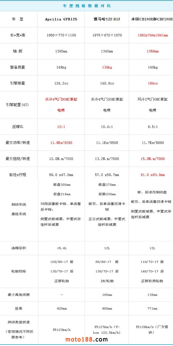 以款型分類的話這三款車真的很難放在一起做出評(píng)價(jià),因?yàn)锳prilia GPR125是一款將125cc發(fā)揮到近乎極限的高比格仿賽車、雅馬哈R15是一款披著跑車外衣的高性能“街車”而本田190R則是一款高配置的純街車,三者單體性能不速又個(gè)性鮮明,高比格、高性能、高配置,三高碰撞各種糾結(jié)就差選車選到高血壓了。