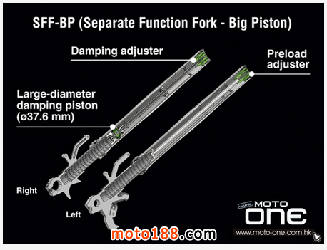 自上一代ZX-6R已開(kāi)始使用Showa Big Piston Fork(BPF),但新款636是首臺(tái)配備Showa BPF及SFF前避震的市販車(chē)。此避震比傳統(tǒng)前叉大接近2倍的活塞,輪胎輾過(guò)各種凸凹路面時(shí),避震油通過(guò)油路更具彈性,使前叉管下壓及回彈更暢順。而 SFF全名是Separate Function front Fork,結(jié)構(gòu)是左叉管行純油壓,右叉管使用傳統(tǒng)的彈簧及油壓,即現(xiàn)在所講的非常流行可左右獨(dú)立調(diào)校的高性能前叉。