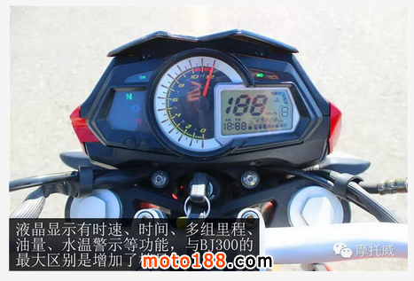 車子加上了檔顯,卻沒有10塊錢就能改裝的雙閃燈,很多黃龍300的車友剛開始騎的時(shí)候說沒有檔顯很奇怪,后來才慢慢習(xí)慣了,這次BJ250采用的液晶儀表功能想當(dāng)齊全。