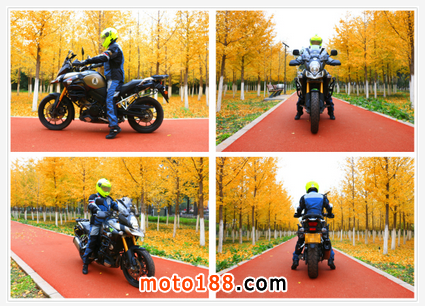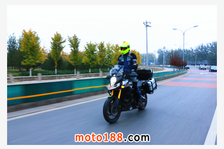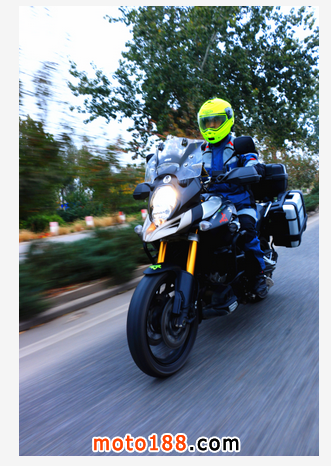 大培子駕駛2014款V-Strom 1000分別在鋪裝路面包括高速公路、砂石路、泥土路和冰雪路面進行測試。2014款V-Strom 1000騎穩定性和操控感有相當好表現,但由于底盤較低通過能力相對不足。低速控車非常靈活,靈活到就像在駕駛一輛400cc摩托車(推、挪除外),高速行駛穩定性可圈可點。如果用“水鳥”去對比的話:低速操控V-Strom 1000更好些,它前部的操控感比“水鳥”輕靈很多更適于在都市駕駛;在高速操控穩定性方面“水鳥”就勝出了,尤其是在速度高于130公里/小時的情況下,V-Strom 1000明顯沒有“水鳥”來得沉穩;路感反饋V-Strom 1000比“水鳥”更清晰。