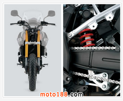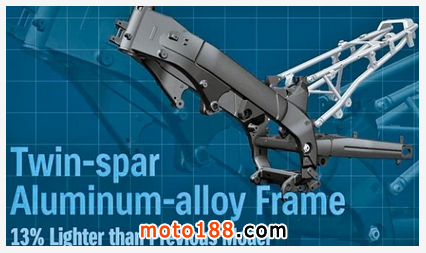 以2002款雙翼梁鋁合金跑車車架為藍本重新設計的新車架,剛性更強、重量更輕并融入了全新幾何結構設計。相比老款,新后搖臂加長20mm, 前軸至中軸距縮短6mm,這意味著轉向更靈活度、高速更穩定性。前、后Kayaba(KYB)全段可調減震器,43mm倒置式長行程前減震、連桿式后減震。