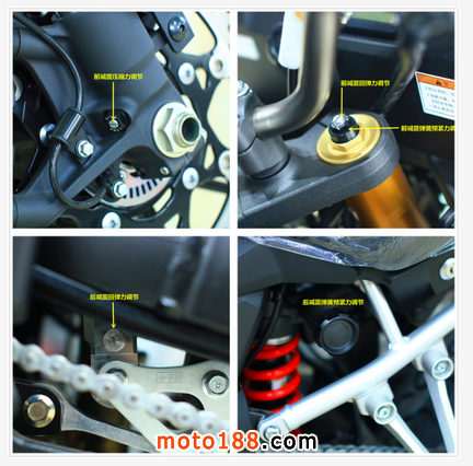 對前、后減震做自適應調節是非常重要的,重要到調整后的“它”有脫胎換骨的感覺,不過這往往被很多玩家所忽視,基本就是“買來啥樣就啥樣”。前、后減震的調整需要根據每位駕駛者的體重、駕駛風格、駕駛環境等做技術性調整,這也不是幾百字就能展現出來的,所以大培子在此也僅僅是一種提示,前、后減震下壓預載、回彈力以及與駕駛者匹配性調整一定要選擇專業人士進行,因為這不僅僅關系到性能還關系到安全。