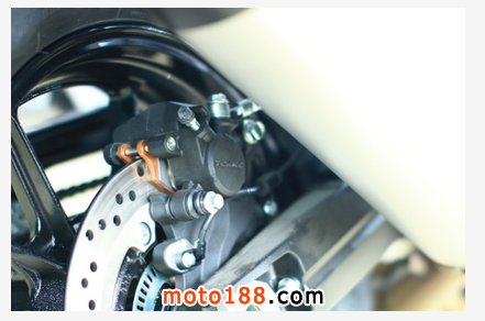 2014款V-Strom 1000前制動采用雙浮動盤東機工(Tokico)對向四活塞輻射式雙卡鉗,后制動配置東機工單活塞卡鉗,博世(Bosch)ABS防抱死系統為標配。