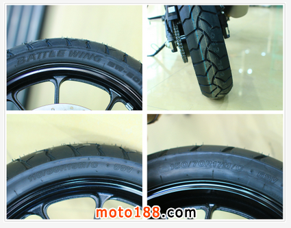 19寸前輪、17寸后輪十輻式鋁輪轂,出廠裝配普利司通戰翼BW-502輪胎。前輪胎規格為110/70-17,后輪胎規格為150/70-17。原廠輪胎在公路上的抓地性能尚佳,但在沙土、泥濘路面真是“只見轉速不見速度”;而在運動駕駛當車體傾角達到約30度左右時,因輪胎觸地弧度問題會導致操控段落感。大培子本人只關注輪胎的性能以及用途,對寬窄......