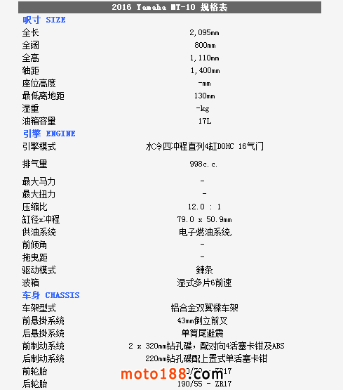 當編者收看廠方直播時,對MT-10的外型有點喜出望外,整臺車像鐵甲機械人,配色在 市販車中也較罕見。由于MT-10屬NK街車,為照顧日常行駛需要,無須像SUPERBIKE的高轉爆發力,據資料顯示,擁有十字曲軸來自R1的引擎經過 重新調校,無須太高轉數的起步,更著重低至中段的馬力輸出,并有更線性的表現,可是廠方沒有公佈馬力及扭力的數值,而消聲器也跟R1相同。