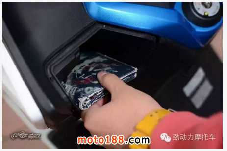 除了座下儲物箱,轉(zhuǎn)向柱兩側(cè)也是大多數(shù)踏板車喜歡利用的空間。在這方面,三車中當(dāng)屬城市之星的儲物盒最大,其深度甚至可以讓人將整只手和手腕完全伸進(jìn)去。圣甲蟲在這里的儲物盒就明顯寒酸了許多,好在兩側(cè)都可以用來放置東西,手機(jī)錢包等小件物品不在話下,而且蓋板還是帶鎖的。賽艇300的儲物盒與城市之星的位置相當(dāng),空間雖沒有那么大,但在拿取和放置物品時感覺很順手。