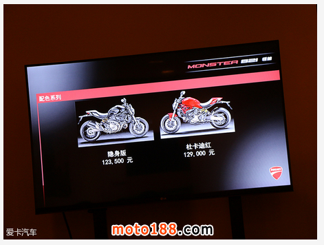 繼一年前杜卡迪在米蘭國際摩托車展上發布了全新一代Monster怪獸1200之后,在2015年11月20日的廣州車展上,杜卡迪在中國市場發布了Monster怪獸821,一款Monster怪獸車系中的全新車型,該車“隱身版”售價為12.35萬元,“杜卡迪紅”售價為12.9萬元。