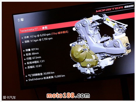 新車由杜卡迪821 Testastretta 11°發動機輸出動力,最大功率84kW(112Ps),峰值扭矩89Nm,另外拜179.5kg的車重所賜,Monster怪獸821的操控更加順暢且平易近人,當然也同時令人印象深刻。輕量化車身之后的極簡主義和性能的混搭讓Monster怪獸821,以一種獨特的摩托感受改變著人們的騎行方式。