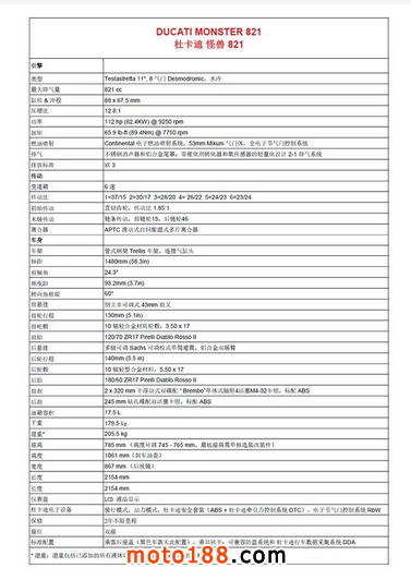 除此之外,高性能剎車系統、出色的減震懸掛、時尚的組裝件組合,以及杜卡迪出色的人體工程學設計,為這一意大利摩托品牌提供了最具魅力的中量級Monster怪獸。該車不僅駕乘極為舒適,配備創新性可調節高度的座椅;還結合了杜卡迪人性化、一鍵式可調騎行模式中的八級可調牽引力控制系統、三級可調ABS和三級可調電子節氣門控制系統。