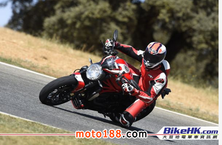 隨著地面變乾,接下來(lái)的試車(chē)時(shí)段可以采用Sport駕駛模式及減低DTC介入,真真正正開(kāi)始測(cè)試這部1200R的潛力。這臺(tái)1200cc的引擎,擁有強(qiáng)橫的中低扭力,出彎時(shí)只要放膽『質(zhì)油』,車(chē)頭便隨即離地,這感覺(jué)實(shí)在太美妙了。在一些較直路段,可以讓油門(mén)盡開(kāi),引擎轉(zhuǎn)速提升得很快,絕對(duì)不遜于一般跑車(chē)。在看臺(tái)大直路尾,需要重收迫力及連退三個(gè)擋,這個(gè)Brembo的迫力加上V2引擎的充足engine brake,可以容許在短時(shí)間內(nèi)讓車(chē)子制住。Ascari這個(gè)賽道有很多不同的彎道,包括連續(xù)的左右彎(chicane),發(fā)夾彎(hairpin)及高速?gòu)?sweeper),可以充分考驗(yàn)這臺(tái)Monster的轉(zhuǎn)向性。當(dāng)反覆在各彎道測(cè)試,令人很驚訝的是這臺(tái)街車(chē)竟然擁有著跑車(chē)的轉(zhuǎn)向特性。在Chicane及Hairpin等彎道,車(chē)身落彎十分敏銳而準(zhǔn)繩,但又不會(huì)過(guò)快令駕駛者有無(wú)所適從的感覺(jué)。駕駛著這個(gè)180kg的車(chē)重時(shí)感覺(jué)上十分輕,比實(shí)際重量輕得多,而且十分靈活。據(jù)Ducati的解釋?zhuān)@是因?yàn)橹匦姆植嫉靡说某晒?br />