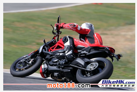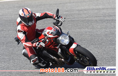 當(dāng)熟悉場(chǎng)地后,可以盡情激烈駕駛,很快便開(kāi)始相信這臺(tái)Monster是可以完全用抯跑車(chē)的方法去駕駛的,只是座姿不相同而已。有賴(lài)于紮實(shí)的車(chē)架及高性能的輪胎,車(chē)身斜度可以很低(有數(shù)次不經(jīng)意地磨到了腳踏)。根據(jù)廠(chǎng)方敘述,車(chē)架設(shè)計(jì)是可以承受50度的傾斜度,對(duì)街車(chē)來(lái)說(shuō),是一個(gè)很夸張的數(shù)字。