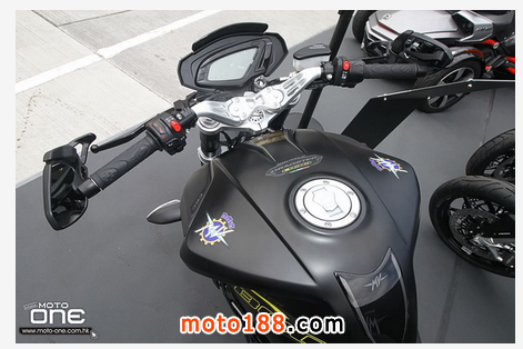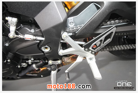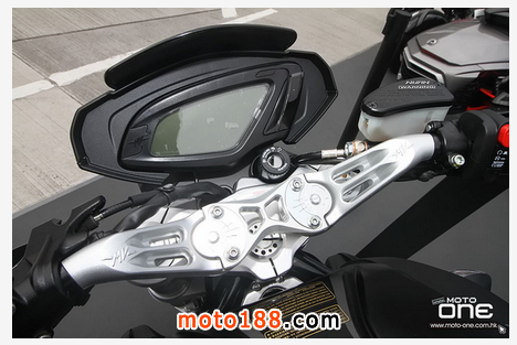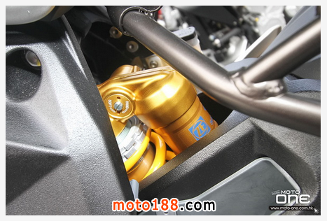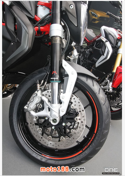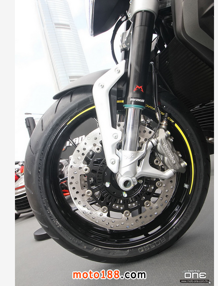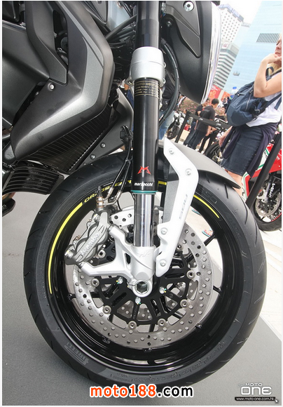 ●水箱加油冷的散熱系統(tǒng),前掣動是雙320mm浮動碟配Brembo放射式四活塞卡鉗,一對擁有全調(diào)校的MARZOCCHI 43mm倒立前叉。