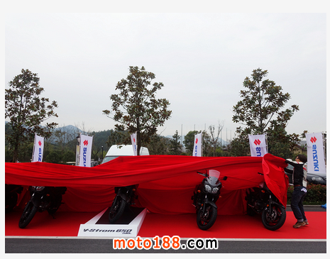 我們將要體驗的SUZUKI V-Strom 650 就蓋在紅布下,有種迎娶媳婦的感覺。
