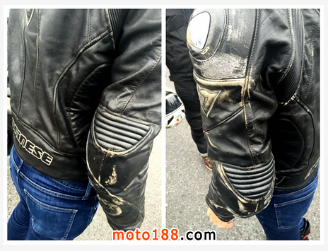一位媒體老師的騎行服,從兩側的傷痕可以看出他的實力。
