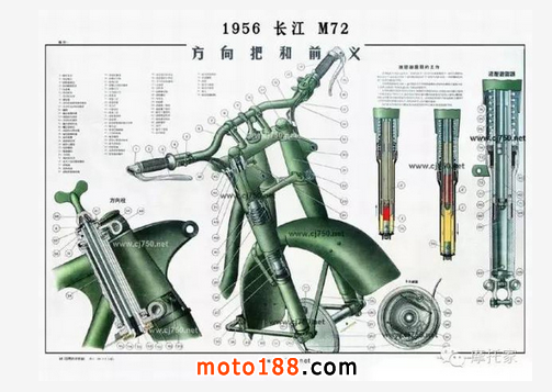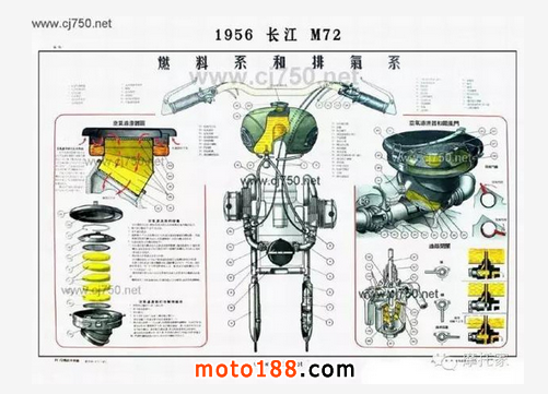 好了,開始講長江750的歷史。20世紀50年代,在蘇聯“老大哥”的支援下,我國參照烏拉爾T-72生產造出了我國自己的長江750M1型摩托車。當時只知道仿制的是蘇聯烏拉爾M72,沒有圖紙,只好采取土辦法——拆,把樣車零件統統拆下來,然后實物測繪。光測繪畫圖紙就用于近3個月,整車完成共651份圖紙,車體部分圖紙編號1308A4,發動機部分圖紙編號1800A4。