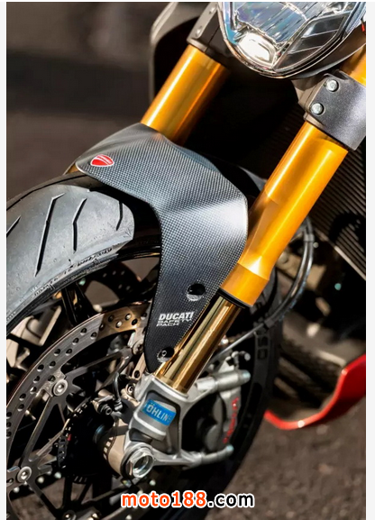 Monster 1200 的前部配置全段可調(diào)的 43mm Kayaba 前叉,尾部配置彈簧預(yù)緊回彈可調(diào)的 Sachs 單筒避震,Monster 1200 S 在此基礎(chǔ)上性能做了進(jìn)一步提升,配置有全段可調(diào)的 48mm Ohlins 前叉,叉芯采用鍍錫涂層處理,尾部配置 Ohlins 全段可調(diào)單筒避震,并帶有外掛式儲(chǔ)油罐。