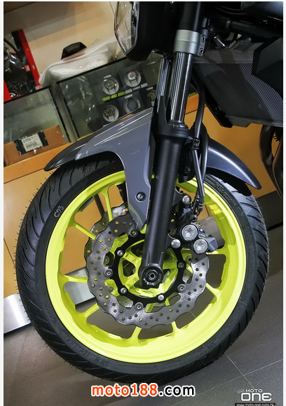 ●2016 Yamaha MT-07 改用螢光黃的前輪框。