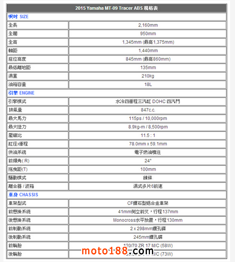MT-09 Tracer ABS是2015年YAMAHA MT-09的變種車款,改為中量級運(yùn)動(dòng)型長途旅行車,而售價(jià)僅多於MT-09標(biāo)準(zhǔn)版本HK$6000元正,而配備的部件,更比MT-09更吸引,令MT-09更多變化及更受歡迎。今次2016 Yamaha MT-09 Tracer ABS 新車抵港,與上年裝備完全相同,仍換上寶藍(lán)色的車身,配合原有的碳纖維花紋車身部件,帶出不同的精彩。