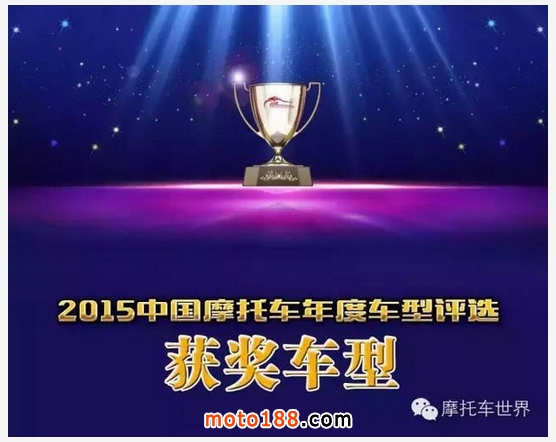 12月6日,2015中國摩托車年度車型評選活動結果在西安隆重發布,獲獎的十佳車型以在“安全、動力、節能、操控、舒適、外觀”六項全能表現以及全國眾多媒 體、俱樂部、廣大車迷的網絡投票、試騎評價獲得該殊榮,獲獎的創新、時尚、動力、運動車型也以在各領域出色的不俗成就獲得單項獎。