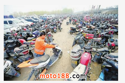 市區(qū)多條道路都懸掛了禁止摩托車行駛的指示牌二環(huán)北路一處違法車輛停放場,停放著數(shù)百輛無牌無證上路被查扣的摩托車。