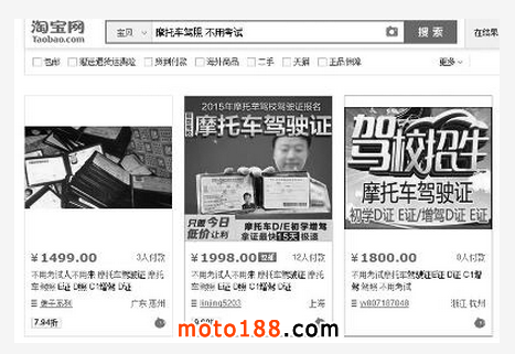 昨天,法制晚報(bào)(微信ID:fzwb_52165216)記者在淘寶網(wǎng)上輸入“摩托車駕照”、“摩托車駕照 不用考試”等關(guān)鍵詞,仍會(huì)出現(xiàn)辦理免試摩托車駕照的網(wǎng)店。