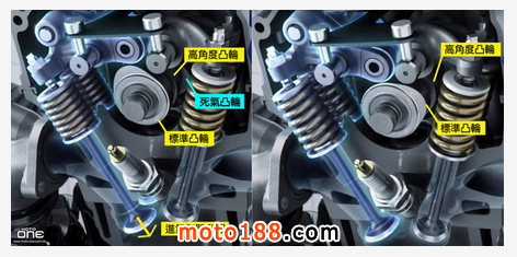 傳統(tǒng)的曲軸只有一個(gè)或同一組相同角度的凸輪,很難兼顧低、中及高轉(zhuǎn)馬力輸出,及達(dá)到省油效果,因此加入兩組不同角度的凸輪,即可變汽門技術(shù)。當(dāng)引擎在低或中轉(zhuǎn)時(shí),使用低角度的凸輪吸氣,進(jìn)入汽缸的空氣相對小,耗用汽油同樣可降低。當(dāng)引擎進(jìn)入高轉(zhuǎn)後便轉(zhuǎn)用高角度凸輪,增加進(jìn)氣氣門(生氣嘩佬)的升程,從而讓更多空氣進(jìn)入汽缸,而行車電腦根據(jù)油門角度及更多進(jìn)氣量為低、中及高轉(zhuǎn)注入適當(dāng)份量的汽油,以達(dá)至省油及尾段延伸的效果。至於NMAX的SOHC單凸輪軸可變氣門怎樣運(yùn)作,以下有詳盡介紹: